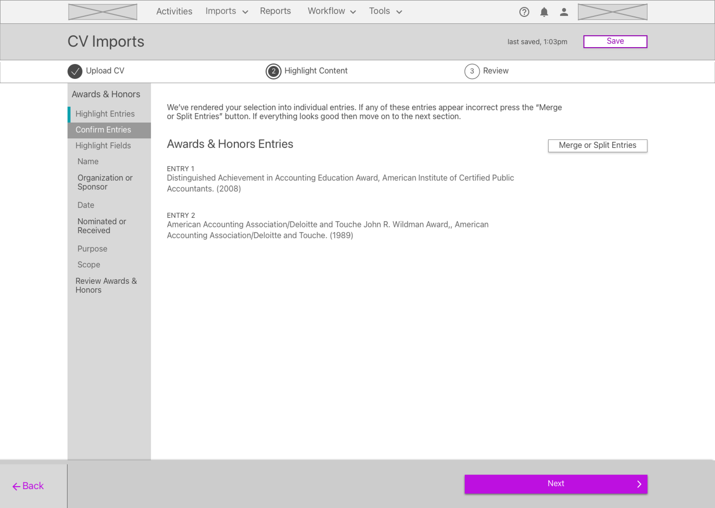 I started by trying to refine the original demo version of CV Imports from the first round of tests, with special focus on feedback that had come from faculty.